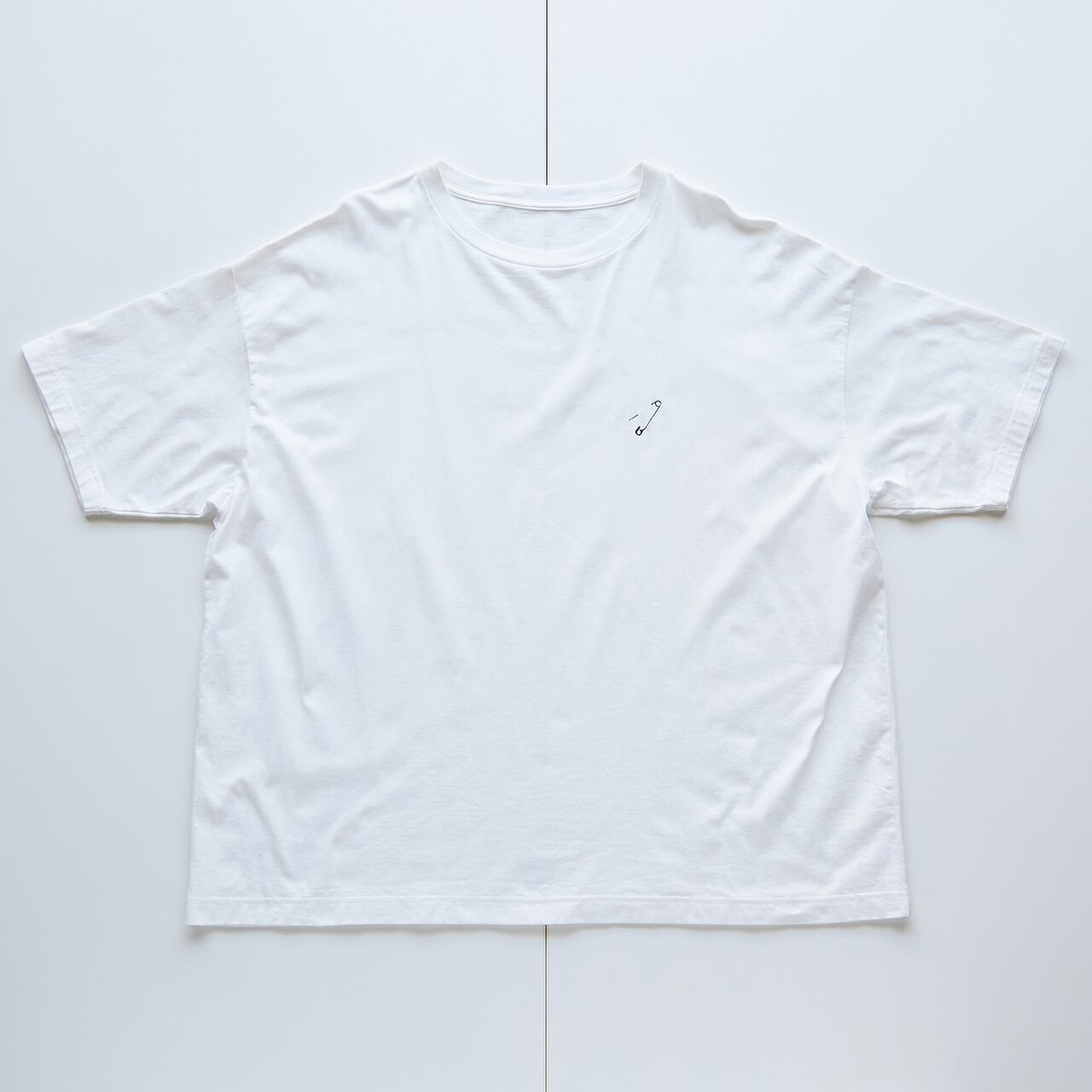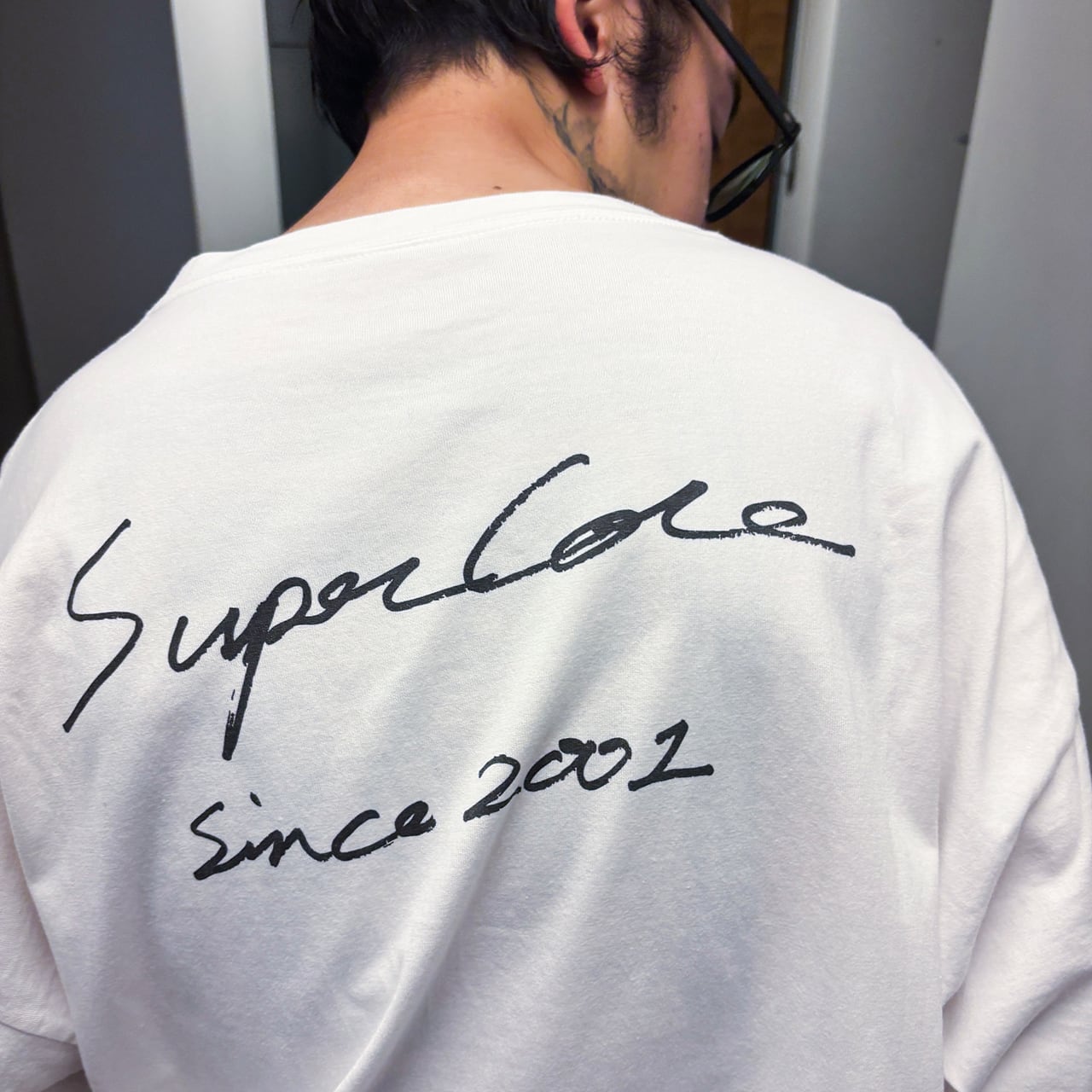 SupercoreがN.Y.でカフェサロンとして生まれた2001年を記した、Tシャツ。胸部にシンプルに安全ピン刺繍。NOストレスなビッグシルエット。